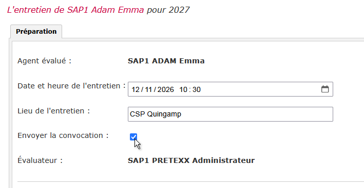 La convocation est alors instantanément envoyée à l’agent et un deuxième onglet "Entretien" apparaît alors dans le tableau.
