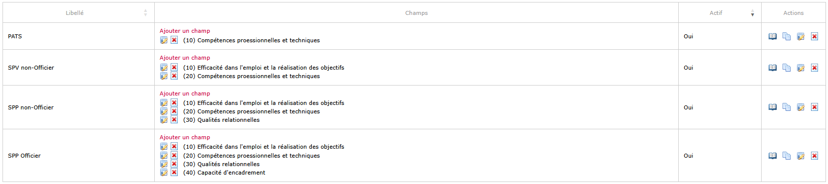 - et tous les éléments (thématiques/sous-thématiques à évaluer et champs de saisie de commentaires) constitutifs du modèle d’entretien utilisé pour l’évaluation spécifique de l’agent.