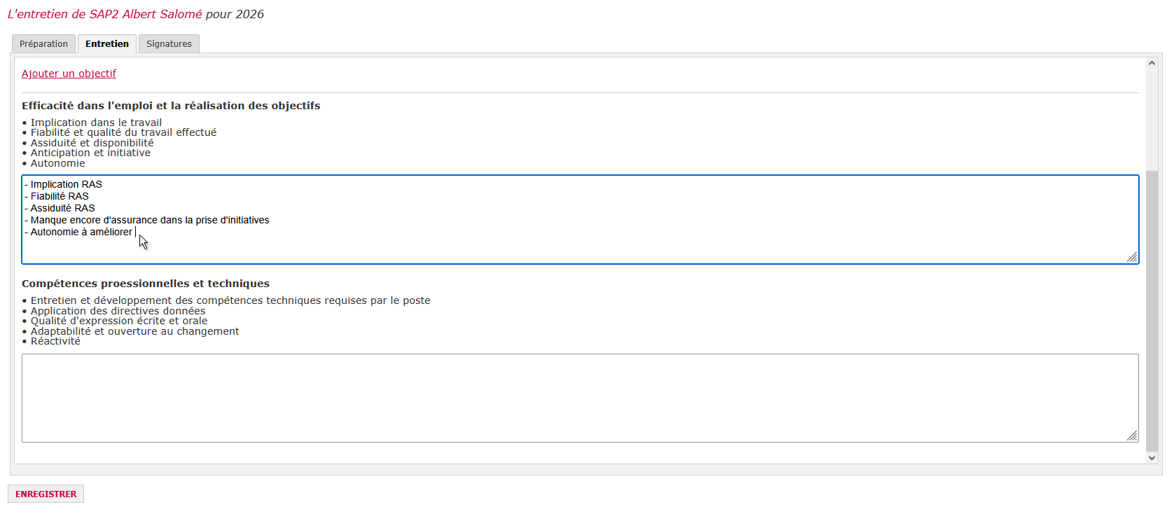 • Suivant son avis et les déclarations de l’agent évalué, l’évaluateur remplit les différents champs de saisie avec des commentaires concis.