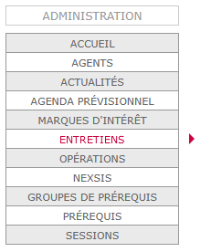 Le gestionnaire d’EMMIE accède au module de suivi des entretiens des agents du SDIS via le menu "ENTRETIENS" du bloc-menus "ADMINISTRATION".