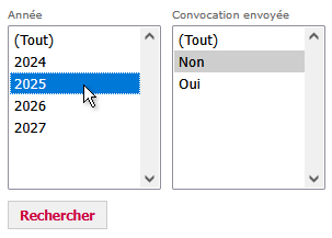 La série de filtres de recherche permet de requêter, avec choix multiples possibles (Ctrl + clic), à partir de plusieurs critères cumulables (années, convocations envoyées, différents degré de signature des entretiens).