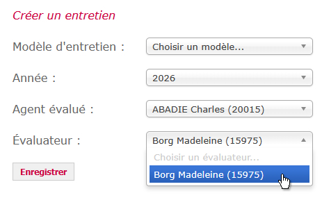 - le choix de l’évaluateur désigné pour cet entretien. La liste déroulante des évaluateurs proposés dépend de l’agent évalué précédemment choisi.